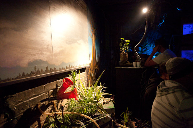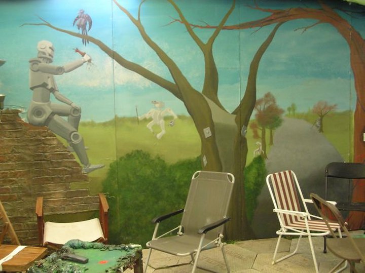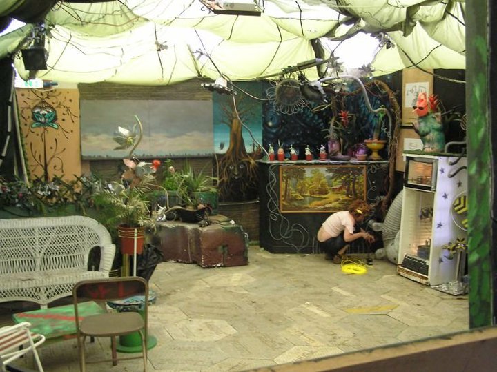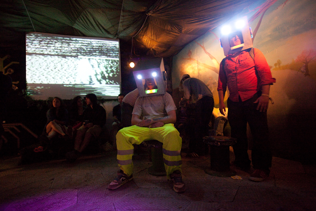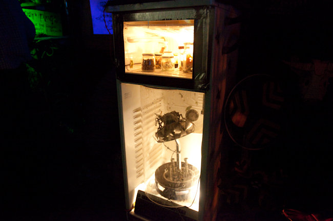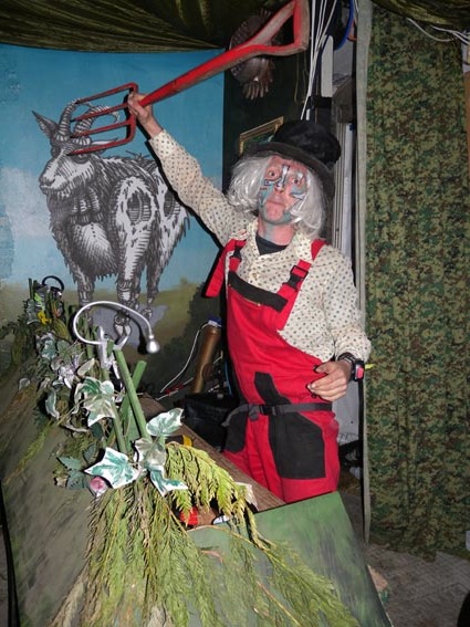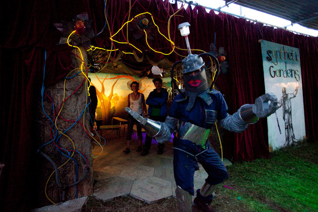Our area of the Shangri-La field was a garden lounge of ‘Naughticulture’ where biomechanical Scarecrows welcomed the visitor into an allotment crammed full of hybrid crops and sentient wild flowers. This sculpture garden was formed from waste and found-objects, and was teeming with half-life and tended by genetically modified farmers.